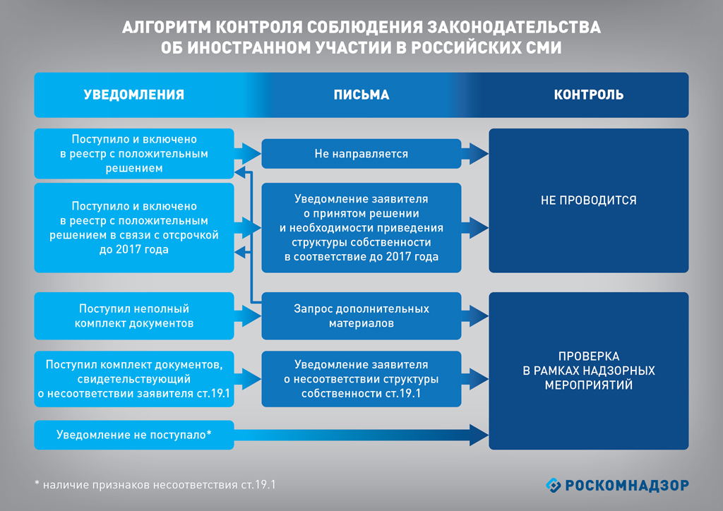 С момента принятия соответствующих поправок к закону «О СМИ» Роскомнадзор проводил консультации представителей отрасли по новым требованиям законодательства. В сферу применения данных норм закона попали ок. 1000 российских СМИ (ок. 400 учредителей). В ходе консультаций абсолютное большинство участников рынка выразило готовность привести структуру собственности в соответствие закону.