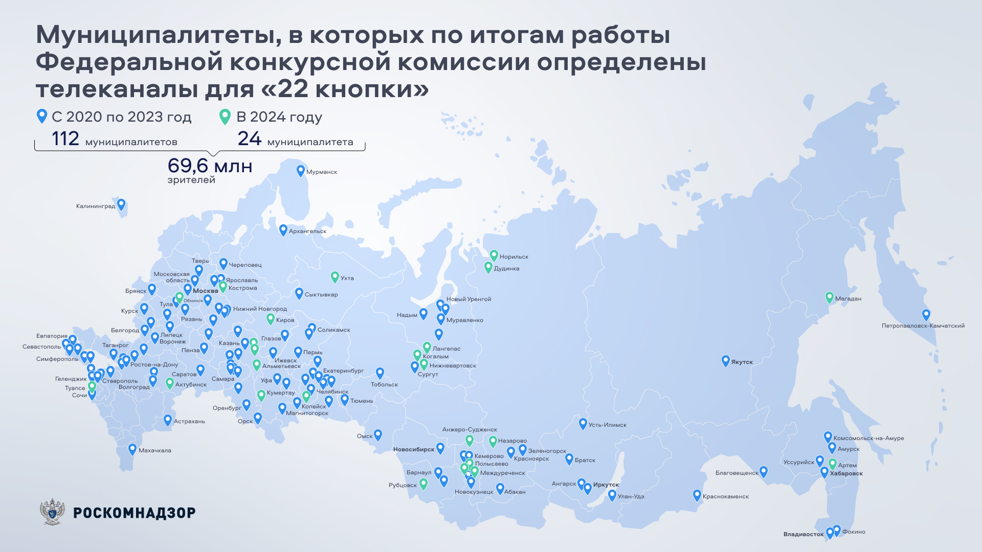 С начала проведения конкурсов по выбору телеканалов для «22-й кнопки» жители почти 140 муниципалитетов России получили возможность смотреть местные новости по городским телеканалам. Общая численность населения этих муниципалитетов составляет 69,6 млн человек. Отбор обязательных общедоступных муниципальных каналов, которые операторы кабельного телевидения обязаны бесплатно размещать в своих сетях на 22-й позиции, проводит Федеральная конкурсная комиссия по телерадиовещанию при Роскомнадзоре (ФКК).